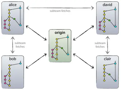 每一个开发者都围绕着 origin 存储库进行着 pull 和 push 操作,这显示出了 origin 存储库的中心性,但是除此之外,每个开发人员都可以从其它对等方拉取他们的更改来组成子团队,这在开发人员过早地将自己进行的工作推送到主分支上之前,与两个或更多的开发者共同完成一个较大的新功能时是很有用的。正如上图所示,这几个开发成员之间可以很自然地形成很小的子团队: Alice 和 Bob,Alice 和 David,以及 Clair 和 David。