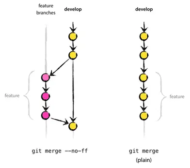 $ git push origin develop合并中的 —no—ff 标记可以强制为合并操作创建一个新的 commit 对象,将所有原来属于 feature 分支的 commit 记录打包进这个新的 commit 对象中,进而避免 Git 采用 fast-forward 方式进行分支合并,直接将 develop 指向 feature 造成原本属于 feature 分支上 commit 记录丢失(译注:也就是分不出哪些 commit 是原属于 feature 分支上的 commit 了),下面是采用 —no—ff 与 fast-forward 方式进行合并的对比图。