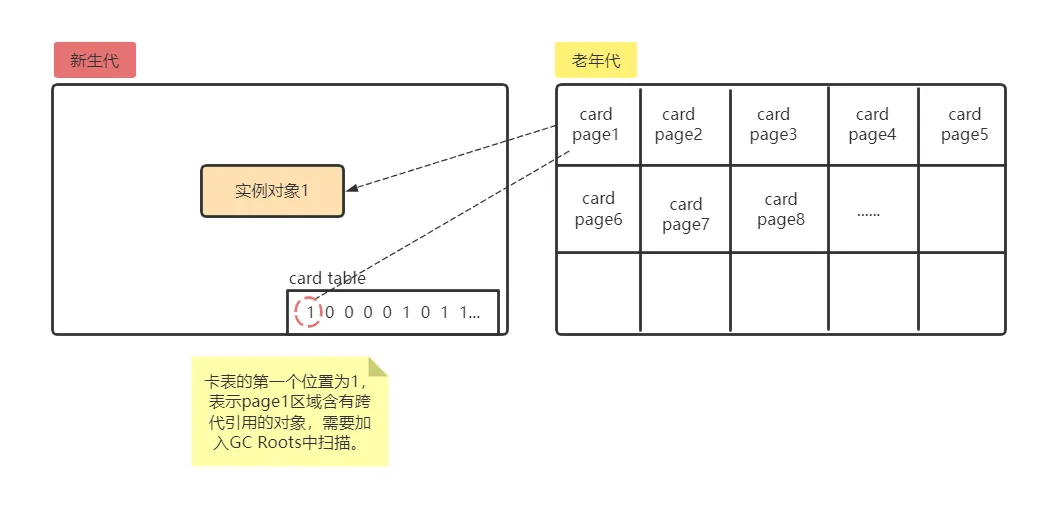 因为cardpage1中存在指向新生代的跨代引用,所以对应卡表的第一个位置为1,表明该page区域存在跨代应用的对象。