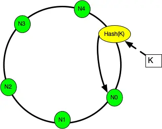 - 将所有槽位(或者节点) N0,..,Nn−1的标号 0,…,n−1依次作为 hash函数的输入(一般情况下对机器的hash计算是采用机器的IP或者机器唯一的别名作为输入值)进行哈希, 把结果分别标记在环上。