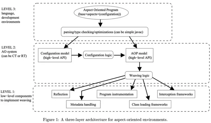 当我们构建面向切面的环境(AOE)时,设计者需要定义一个架构。在现有的大多数AOE中,架构定义并组合基本的模块/组件/APIS。通过对现有工具的学习,我们可以发现一些通用组件(在架构中提供相似的能力,但不一定使用相同的技术实现)。例如,JBoss的织入器使用Javassist来实现拦截机制(在客户端侧),而JAC的织入器使用BCEL来实现拦截机制(在服务器端)。其他技术,例如调用JIT编译器可以被用来实现相同的功能。所有的方法都严重依赖环境。