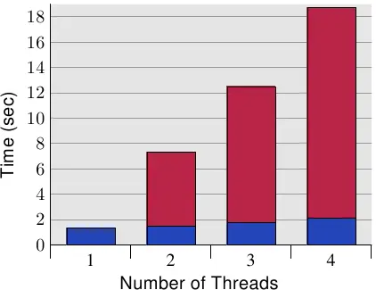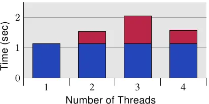 图6.10显示了这种“错误共享”的结果。测试程序(如A.3节所示)创建了许多线程,这些线程除了增加内存位置(5亿次)之外什么也不做。测量的时间是从程序开始到程序在等待最后一个线程后完成。线程被固定在单个处理器上。机器有四个P4处理器。蓝色值表示分配给每个线程的内存分配在单独的高速缓存行上的运行。红色部分是线程位置移动到一个高速缓存行时发生的惩罚。