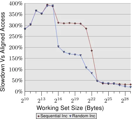 不出所料,在所有情况下,如果工作集能放进 L1d,都不会有负面影响。一旦L1d不再足够,就会通过在进程中使用两条cache line而不是一条来支付损失。红线显示了列表在内存中顺序排列时的数据。我们看到通常的两步模式:当L2缓存足够时,大约有17%的损失,当必须使用主存时,大约有27%的损失。