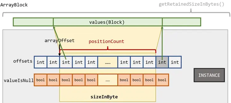 retainedSizeInBytes = INSTANCE_SIZE + sizeOf(valueIsNull) + sizeOf(values);与IntArrayBlock类型类似, ShortArrayBlock、ByteArrayBlock 和 LongArrayBlock 就是把int[]换成了short[],byte[]和Long[], 这几个类型此处就不再赘述了。