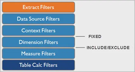 Tableau 中有几种不同类型的筛选器,它们按以下顺序从上到下执行。右侧的文本显示了在此序列中计算详细级别表达式的位置。提取筛选器(橙色)仅在从数据源创建 Tableau 数据提取时才相关。表计算筛选器(深蓝色)在执行计算后应用。可以将度量值筛选器视为等效于查询中的 HAVING 子句,将维度筛选器视为等效于 WHERE 子句。