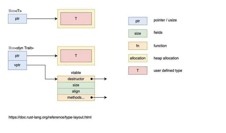 • 特征对象大小不固定:这是因为,对于特征 Draw,类型 Button 可以实现特征 Draw,类型 SelectBox 也可以实现特征 Draw,因此特征没有固定大小